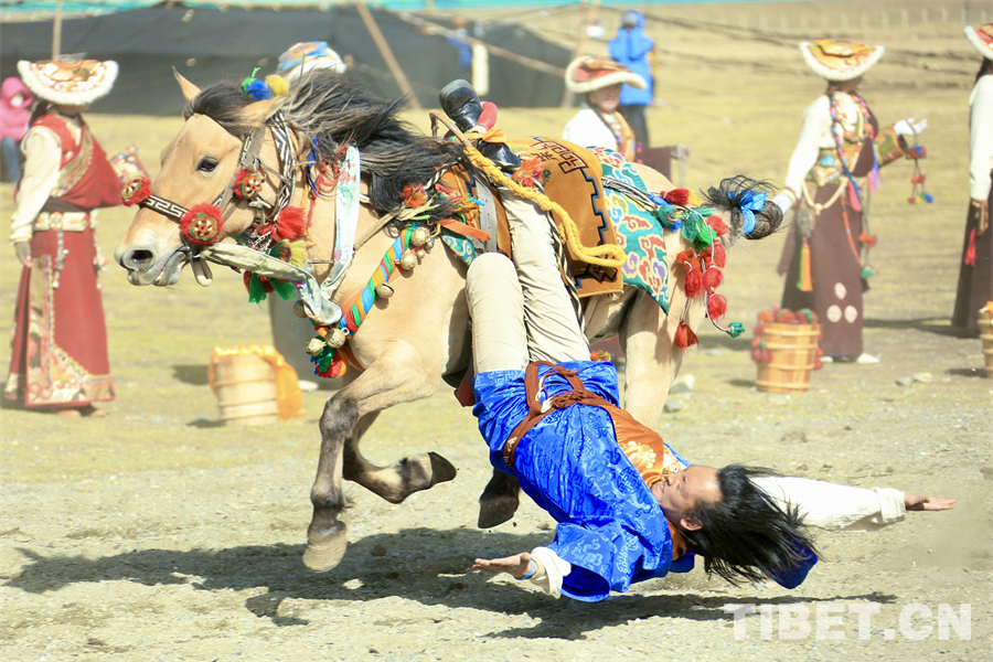 在海拔4000米左右的遼闊天地間,康巴漢子們駕馭著矯健的駿馬、身著華美的傳統服飾,如疾風般掠過金色的草原,在馬背上展示跑馬射箭、乘馬射擊、跑馬拾哈達、跑馬倒立、跑馬懸體等高難度動作,馬蹄聲聲、歡呼陣陣,交織成高原最豪邁的樂章。(中國西藏網 記者/畢然 龍真多吉)