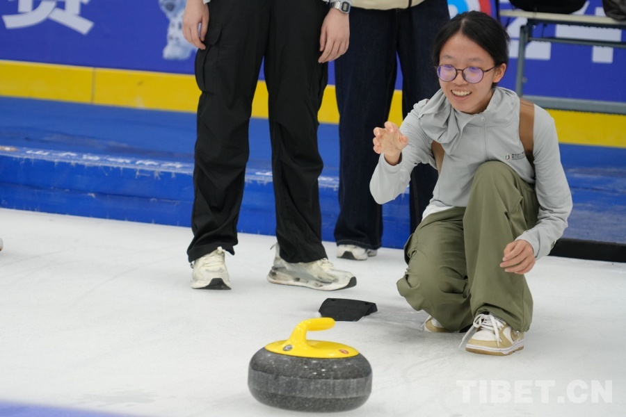 圖為曲文苑在體驗冰壺運動 攝影:馮重霖
