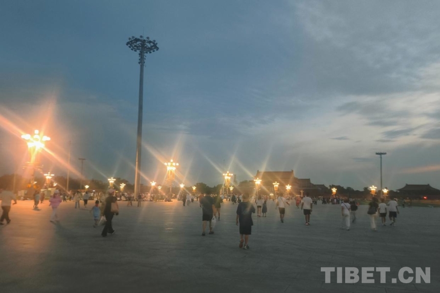 暑期的天安門廣場更加熱鬧,不僅有一家老幼同游的家庭,有旅行社帶來的各地旅游團,最多的是各種學校、團體組織的大大小小的學生團,他們身著不同顏色款式的服裝,共同等待著激動人心的時刻。“山河同脈·京華筑夢”研學團的少年們便是其中一員,他們穿著淺藍色的T恤,戴著白色的棒球帽,散發著西藏少年的朝氣。