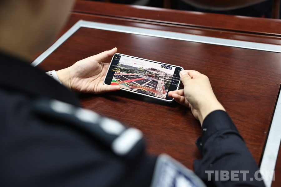 圖為聶拉木出入境邊防檢查站民警利用手機觀看西藏自治區成立60周年慶祝大會
