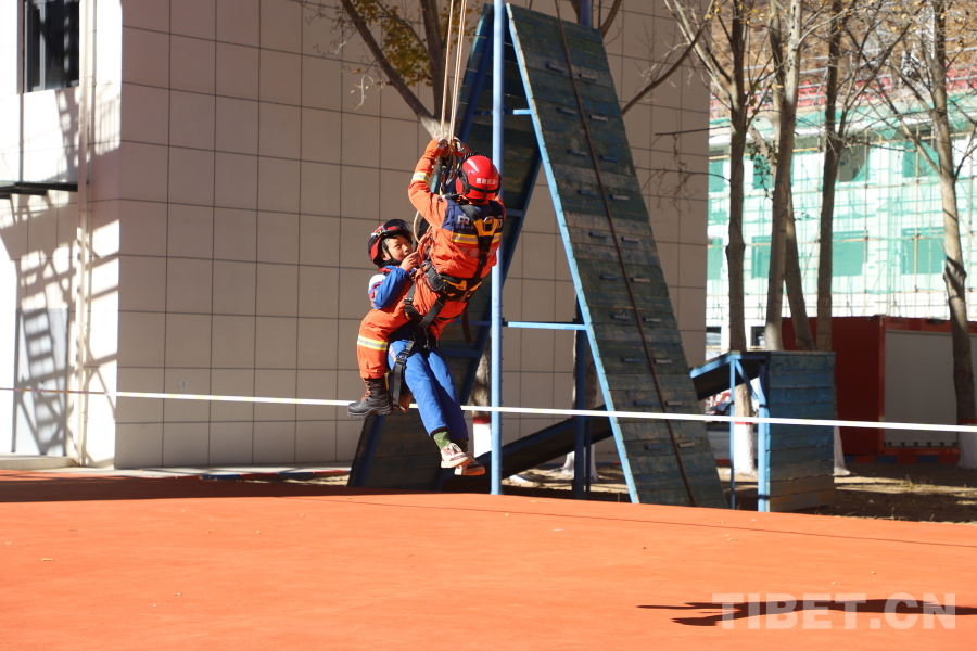 圖為模擬高空索降救援,消防員懷抱孩童安全演練,體驗驚險救援瞬間。