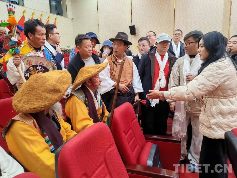 在南木林縣湘巴文化藝術(shù)中心內(nèi),南木林鎮(zhèn)雪藏戲隊(duì)的演員們頭戴色彩鮮艷的五彩面具,將經(jīng)典藏戲《智美更登》選段演繹得蕩氣回腸。高亢唱腔極具穿透力,粗獷又滿(mǎn)含張力的舞步踏在舞臺(tái)上,每一步都踩出湘巴藏戲的獨(dú)特韻味。接著,《格薩爾說(shuō)唱》的雄渾敘事、《土布加諧慶》的歡快韻律、《扎木念》的悠揚(yáng)曲調(diào)一一上演,一場(chǎng)非物質(zhì)文化遺產(chǎn)的盛宴令調(diào)研組成員陶醉。他們的手機(jī)鏡頭緊緊追隨演員,將精妙的表演、動(dòng)人的唱腔定格。表演間隙,調(diào)研組的藝術(shù)家們與演員圍坐在一起,圍繞表演技巧展開(kāi)深入交流,探討唱腔中氣息的綿長(zhǎng)運(yùn)用,研究舞步里節(jié)奏的細(xì)微變化。在思想的碰撞中,藏戲藝術(shù)的傳承創(chuàng)新脈絡(luò)愈發(fā)清晰。
