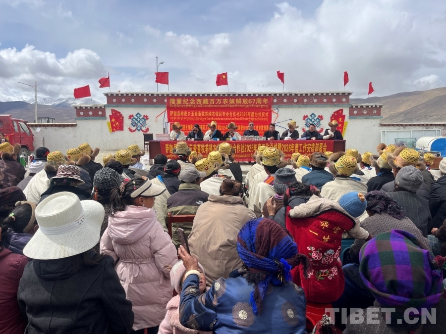 中國西藏網訊 3月28日,西藏日喀則市薩迦縣雄麥鄉舉行紀念西藏民主改革67周年暨2025年度玉麥畜牧養殖農牧民專業合作社分紅儀式。