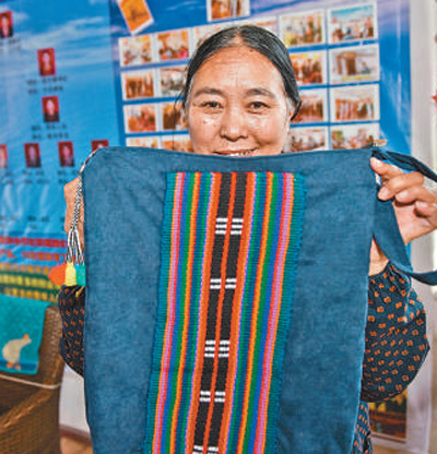 格爾木市長江源村崗巴布民族手工藝品專業合作社的社員展示制作的工藝品。攝于2020年5月。新華社記者 吳 剛攝