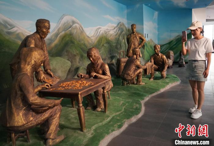 圖為游客在青海新千國際冬蟲夏草文化博物館通過雕塑了解蟲草銷售過程。馬銘言 攝