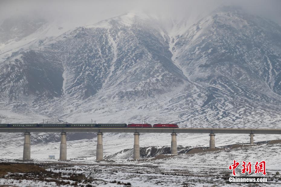 2月22日,鐵路列車從祁連山下行駛。一場春雪過后,青海省海北藏族自治州門源縣境內,連綿不絕的祁連山脈被白雪覆蓋,大地銀裝素裹,靜謐純凈,盡顯壯美山川。中新社記者 馬銘言 攝
