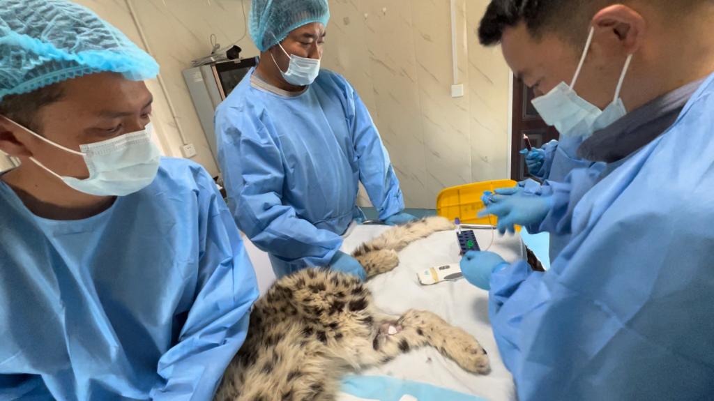 青海野生動物救護繁育中心工作人員在救治雪豹幼崽“凌小芒”。新華社發