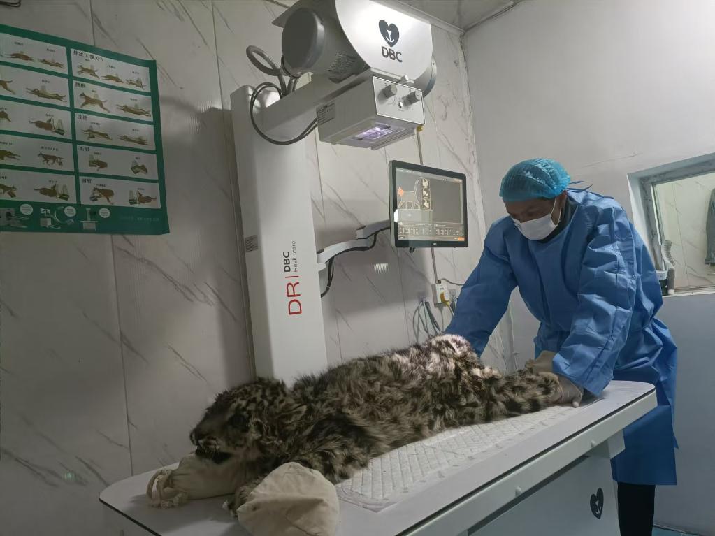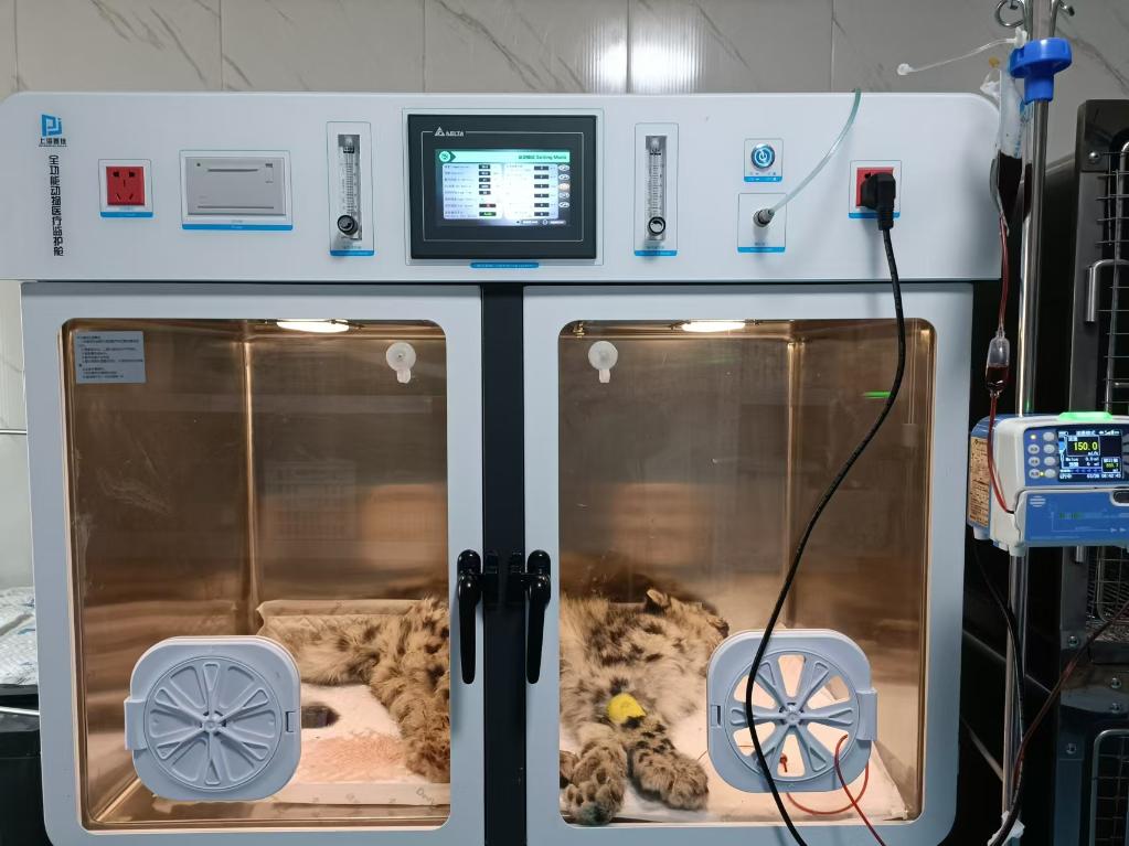 雪豹“凌小蟄”在恒溫氧艙中接受治療。