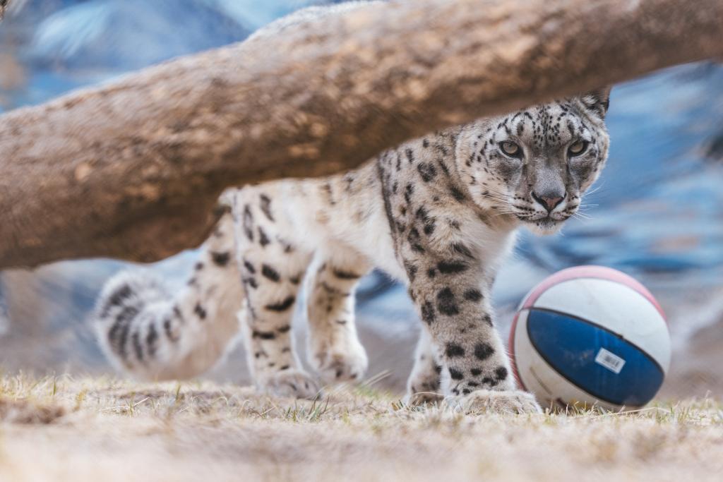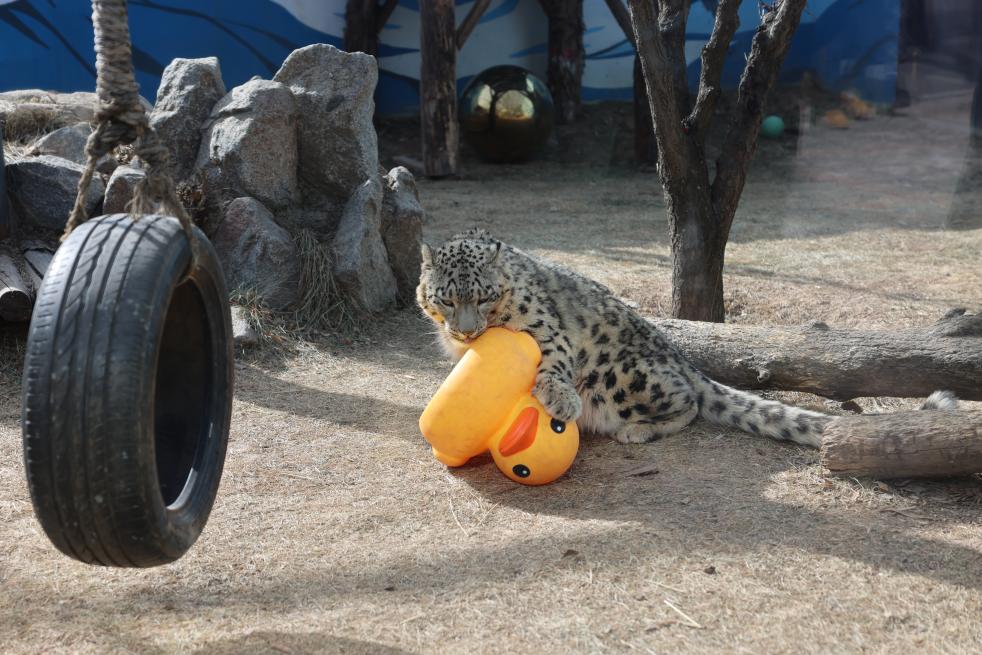 雪豹“凌小蟄”在雪豹館內和“大黃鴨”玩具玩耍。