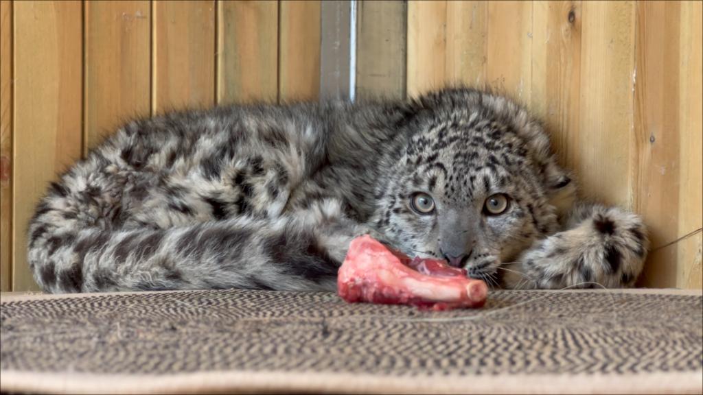 雪豹“凌小蟄”在身體逐步恢復健康后進食。