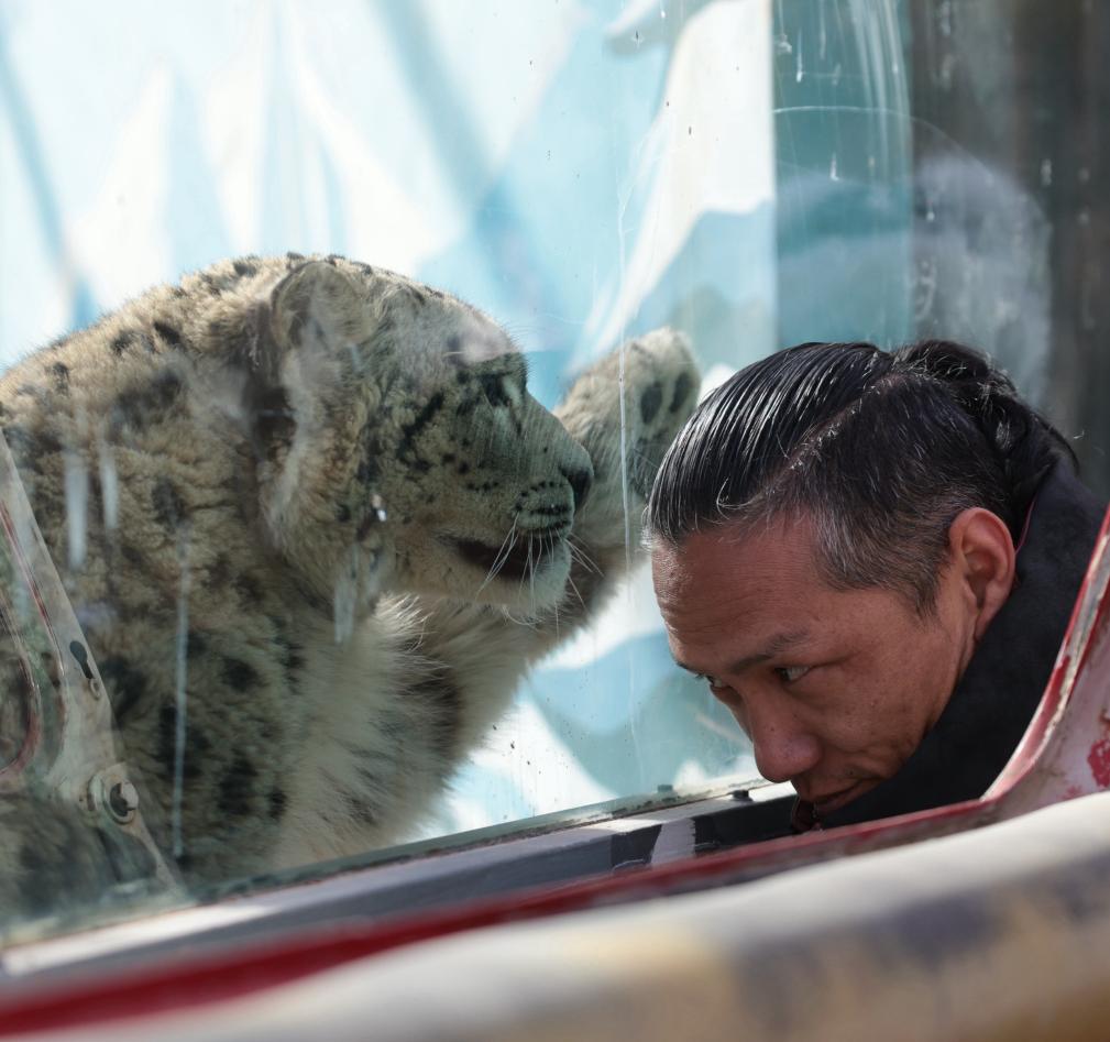 雪豹“凌小蟄”在雪豹館和獸醫趙海龍隔窗互動。