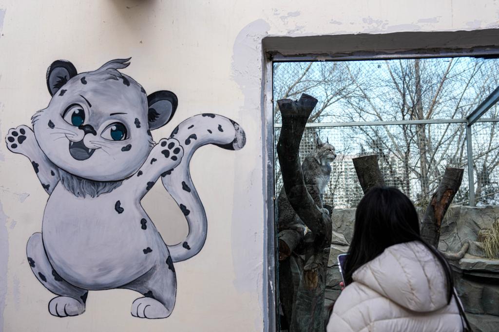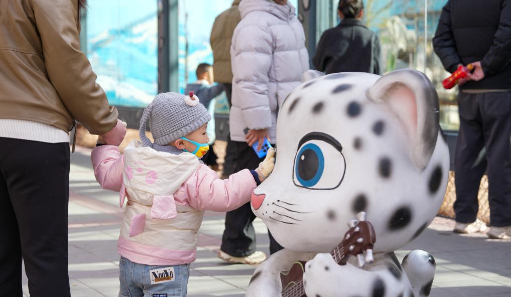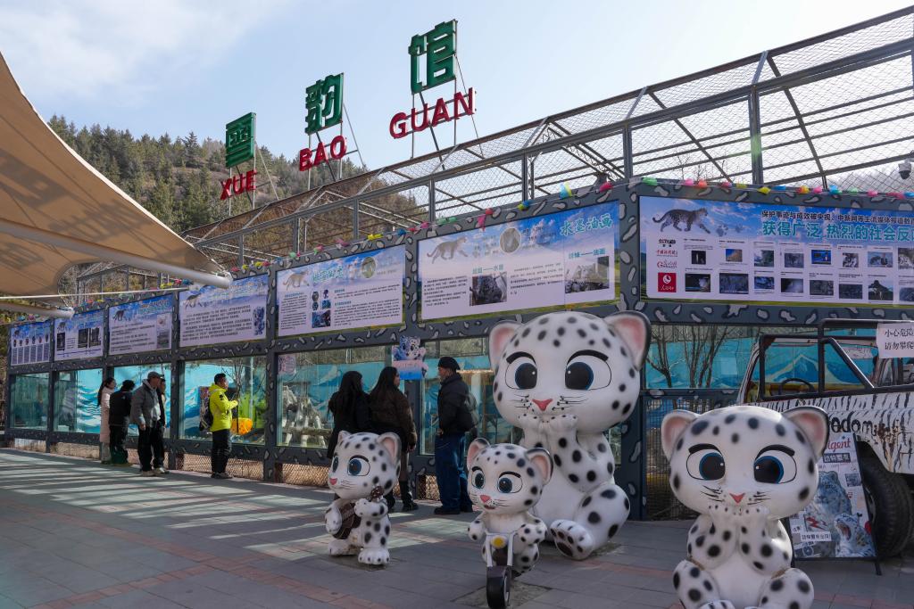 在西寧野生動物園,小朋友和雪豹玩偶互動。