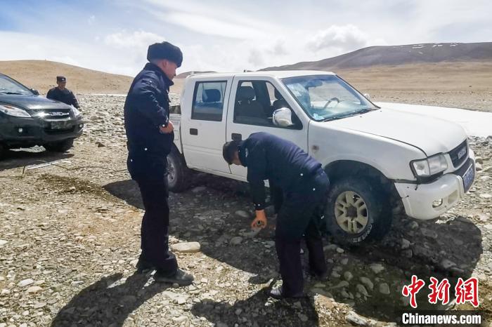 圖為派出所民警在無人區(qū)救助被困車輛。普瑪江塘邊境派出所 供圖