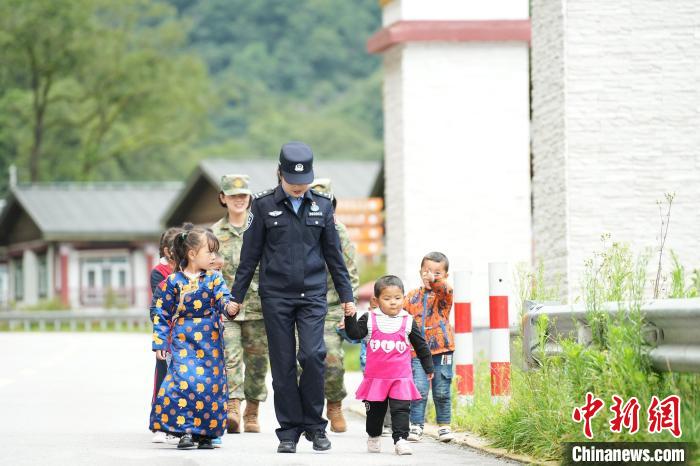 圖為戍邊民警與駐地部隊(duì)官兵攜龐達(dá)村雙語幼兒園小朋友行走在村里。李錦輝 攝
