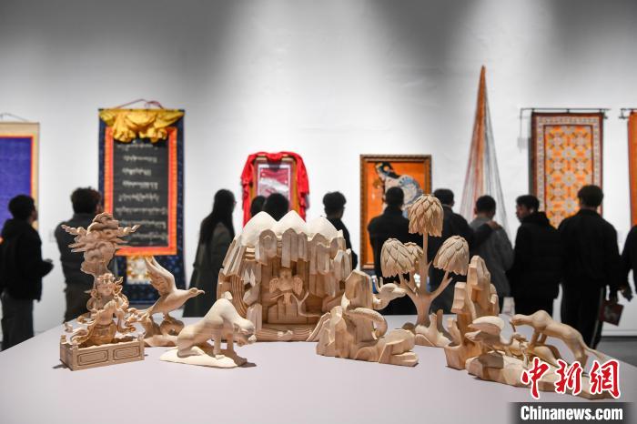 4月9日,“盛世禮贊·西藏工藝美術作品區內巡展”在拉薩首展。此次展覽精心籌備,從西藏全區234位創作者送選的468件作品里,精心挑選出75位作者的100件代表作。展覽分為“精雕細琢·各美其美”“古韻丹青·美人之美”“多姿多彩·美美與共”三個板塊,借多種形式,全方位展示西藏自治區成立60年來傳統工藝美術行業的發展成就。圖為展覽現場。中新社記者 貢嘎來松 攝