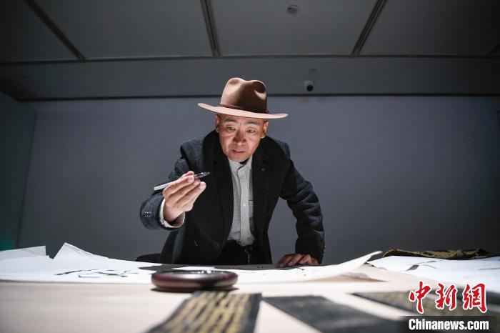 圖為展覽現場,藏文書法創作。中新社記者 貢嘎來松 攝