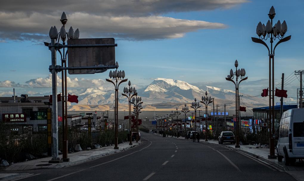 塔爾欽小鎮中心街道南望,可見終年積雪的納木那尼峰。新華社記者 丁增尼達 攝