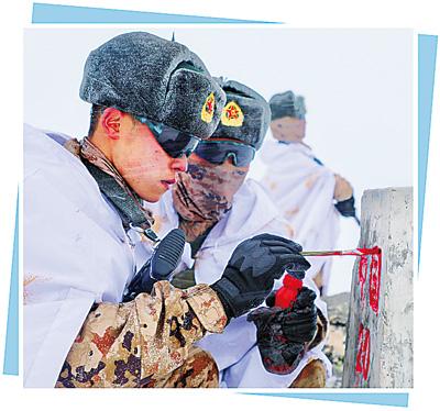 天色漸暗,山頂氣溫驟降,寒風呼嘯。官兵們臉上沒有一絲畏懼,年輕的面龐更加堅毅,互相鼓勵的聲音在隊伍中回蕩,“界碑不遠了,再加把勁!”