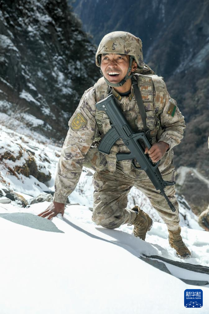 2024年1月5日,巡邏途中,西藏軍區某團一級上士次羅布和戰友們翻越雪山。新華社發(張照杰 攝)