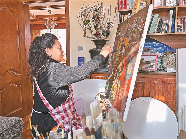 她的創作,始終與腳下土地的變遷同頻共振。從記憶中塵土飛揚的拉薩街巷,到如今南北山披綠、現代樓宇與傳統院落和諧共生的新城,她既是見證者,也是記錄者。