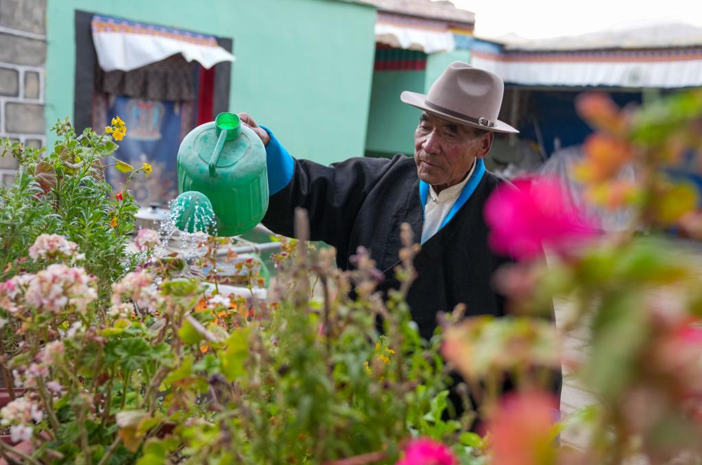 達瓦片多在院子里給花澆水(3月12日攝)。