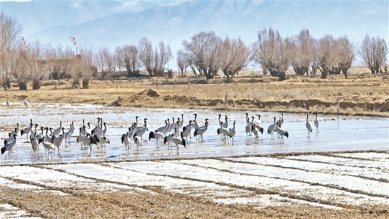 天氣漸寒,在雅江之畔的日喀則市南木林縣艾瑪鄉(xiāng),越來(lái)越多的黑頸鶴陸續(xù)抵達(dá)棲息地。