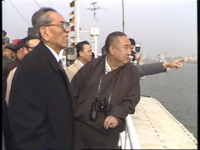 圖為1987年4月19日,十世班禪大師和阿沛o阿旺晉美率領(lǐng)援助西藏發(fā)展基金會籌備委員會委員考察天津港。