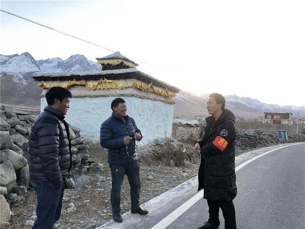 生前擔任甘孜州甘孜縣夏拉卡村駐村第一書記的馬伍薩(右)在巡防路上和村民交流(資料照片)。新華社發