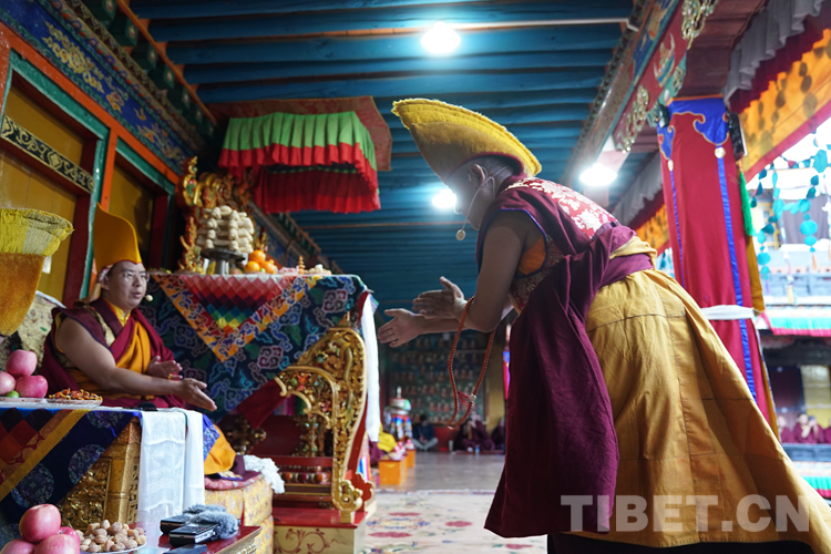 27日(藏歷9月22日),扎什倫布寺舉行祝賀班禪獲得嘎欽學位吉祥祈愿法會。班禪向在場所有僧眾摸頂賜福,并與僧眾集體誦經,回向祈福饒益眾生、法務昌隆、國泰民安、風調雨順。