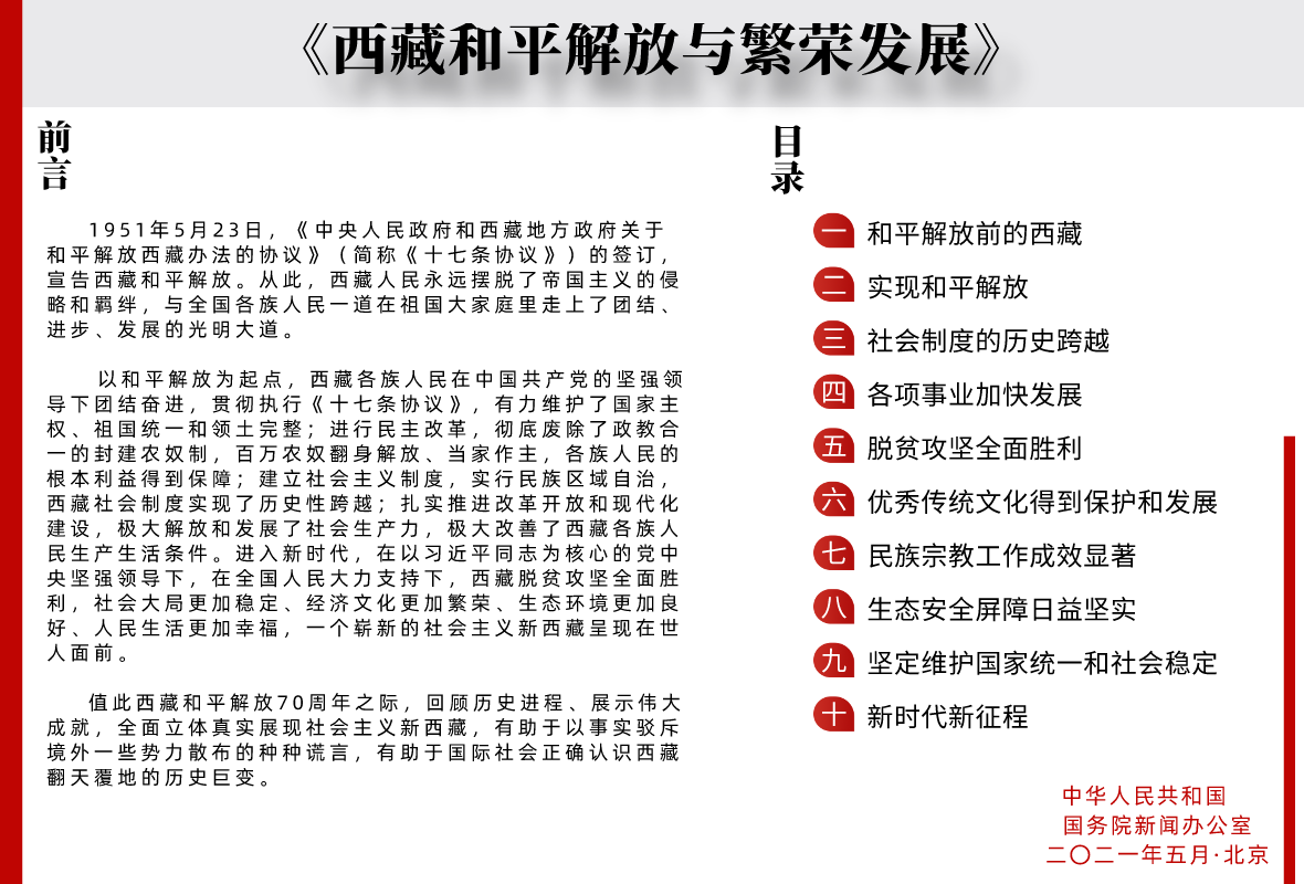 國務院新聞辦公室21日發表《西藏和平解放與繁榮發展》白皮書。全文如下: