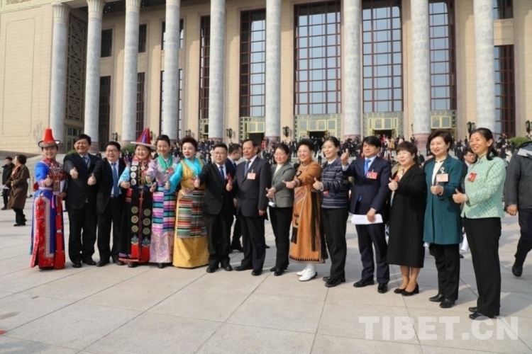 圖為2024年全國政協會議閉幕后,邊巴拉姆(左五)與全國政協委員們在人民大會堂前留影 攝影:王茜