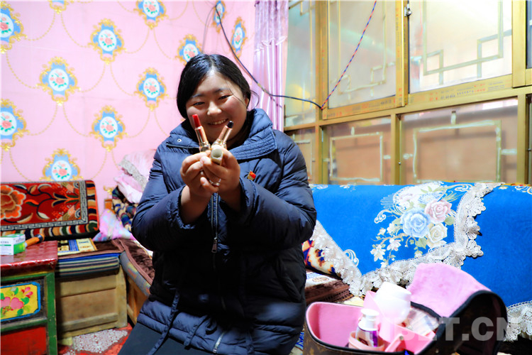 圖為旦增卓措展示她的雙色口紅 攝影:王茜